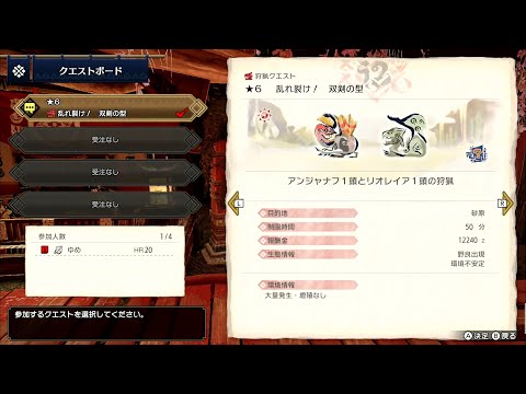 | 集会所上位 ★6 | 狩猟 アンジャナフ 1頭とリオレイア 1頭の狩猟 |