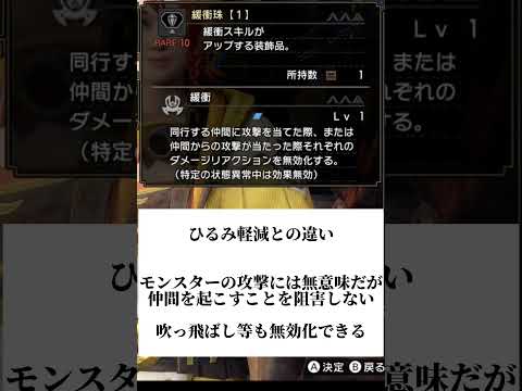 『モンスターハンターライズ』に登場する「緩衝」のスキル効果やスキルが発動する防具・装飾品などの攻略情報を解説しています。