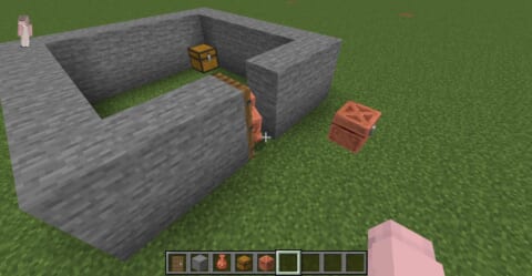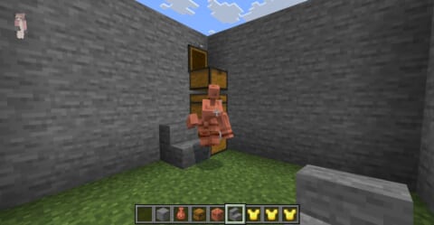 酸化具合で開けるチェストの種類が変わるわけではなく、銅ゴーレムは錆び具合が最後まで進行しない限り問題なく周囲の銅チェストを開けるので、あくまで見た目の変化にとどまります。