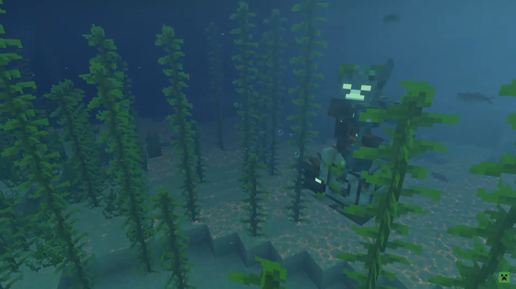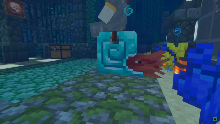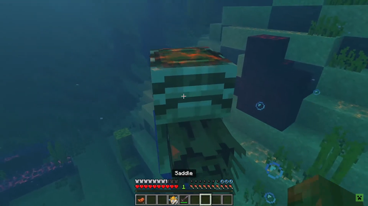 さらに、懐いているオウムガイに「鞍」を装備して搭乗でき、水中を自由に移動できます。オウムガイに乗っている間は水中呼吸が可能なため、水中を自由に探索できるようになります。搭乗状態でも作業を行うことができ、ブロックの破壊や水中での建築の自由度が上がります。