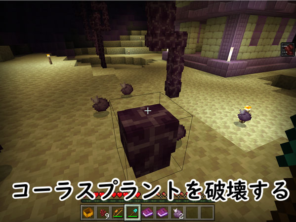ネザーではネザーウォート、ジエンドではコーラスフルーツが収穫できますがどちらも敵対Mobがいるので、防具を持っている場合は装備してから行くようにしましょう。