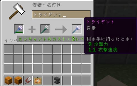 2本のトライデントのうち、不要なものを右側に入れることで 左側のトライデントのエンチャントを維持したまま耐久力を回復させることができます。