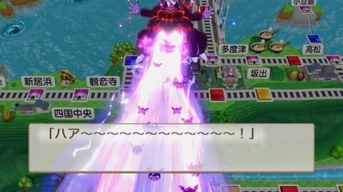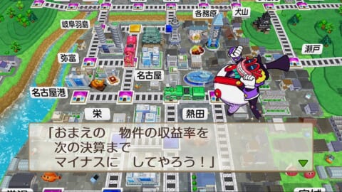 その後ルーレットが出現し、カード駅や物件駅、ヘリポート駅などからランダムに1種類、マイナスが10倍となる特殊な赤マスに変更する悪行を行います。