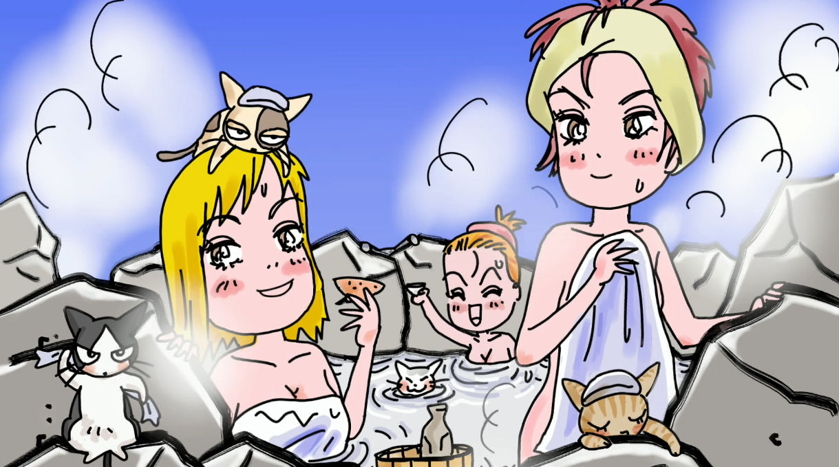 一度温泉イベントを見た後は、メインメニューの「おまけ」の「温泉」から、いつでもイラストを確認できます。