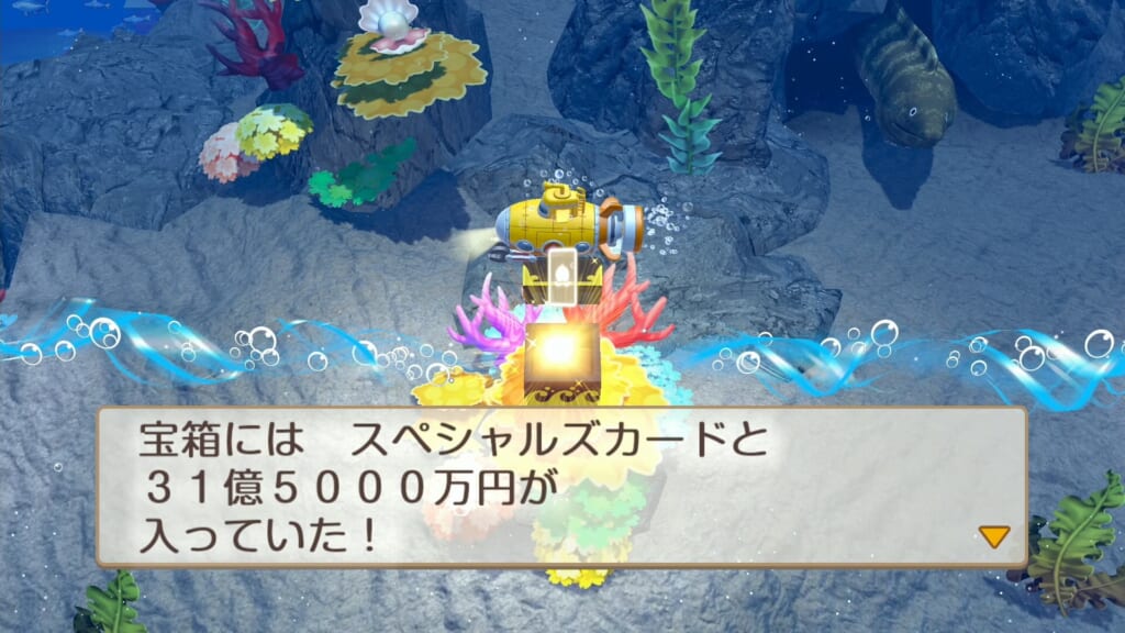 宝箱駅に止まることで、多額の現金と スペシャルズカード などの有用なカードが手に入る上、他のプレイヤーは ぴったりカード などを使わないと海中マップに入ることができないので、ボンビー対策としても非常に役立ちます。