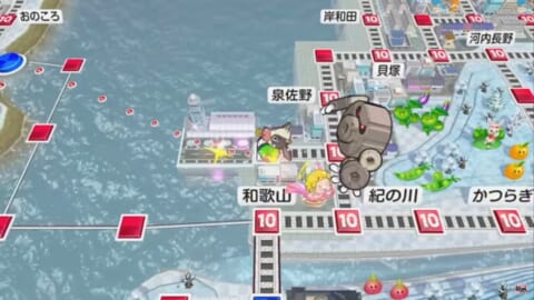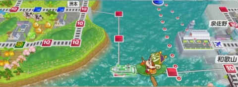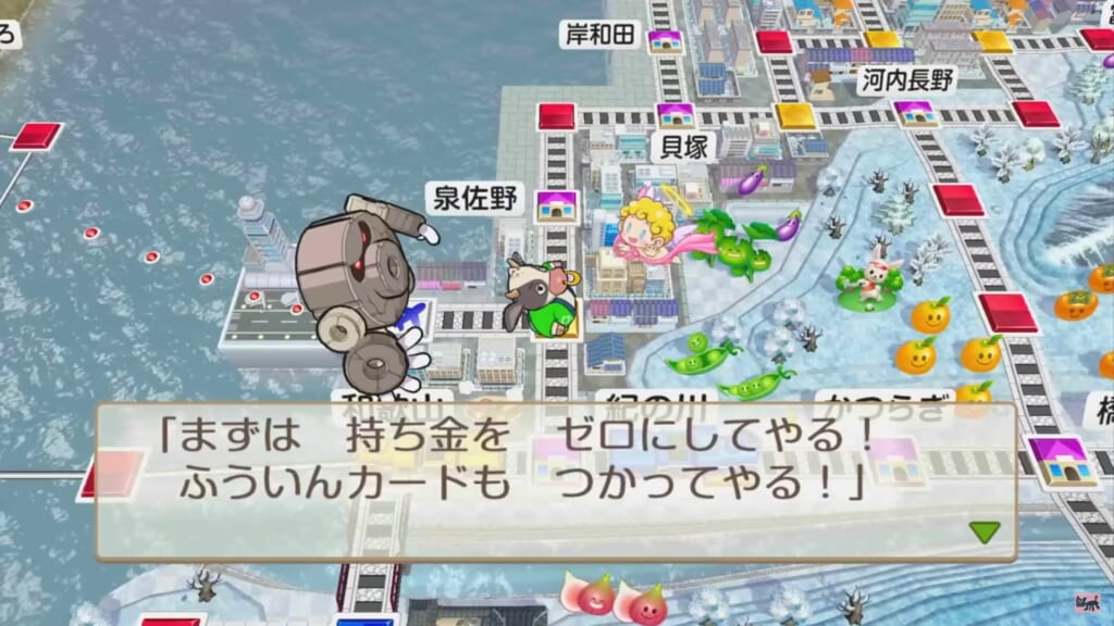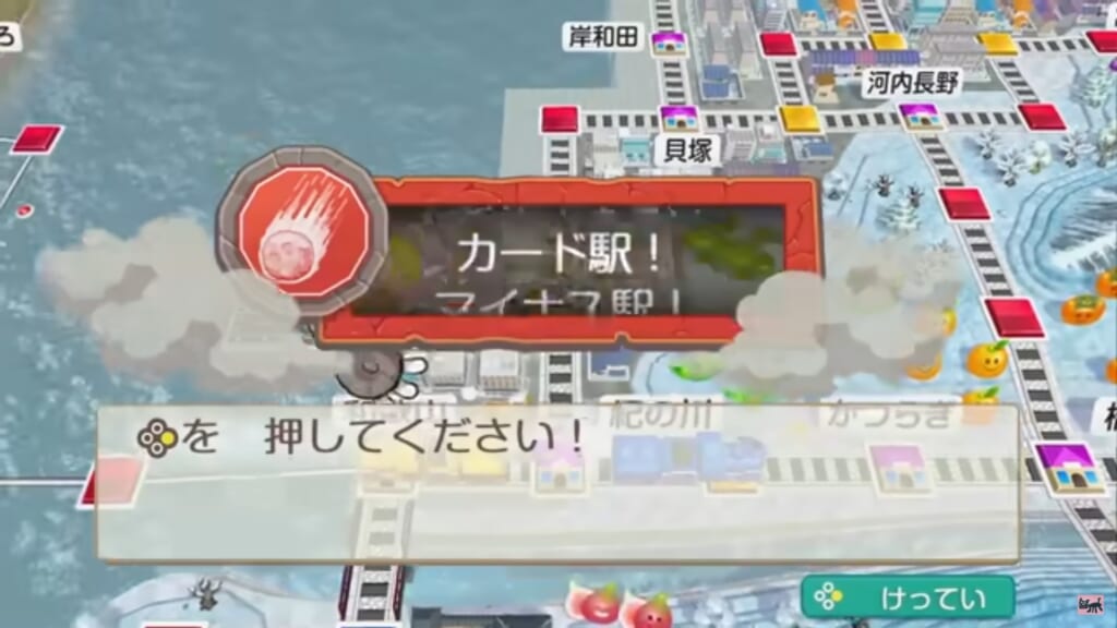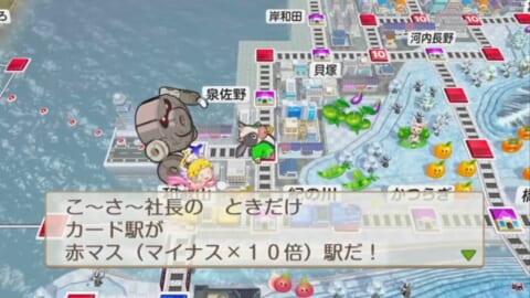 その後ルーレットが出現し、カード駅や物件駅、ヘリポート駅などからランダムに1種類、マイナスが10倍となる特殊な赤マスに変更する悪行を行います。