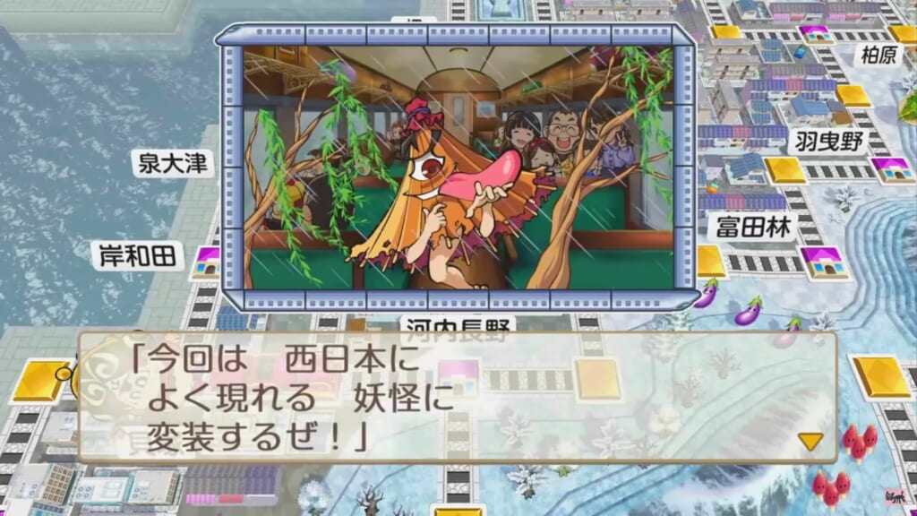 今作『桃太郎電鉄2(桃鉄2)』では、スリの銀次は日本各地にいたとされる妖怪の姿に変装して登場します。