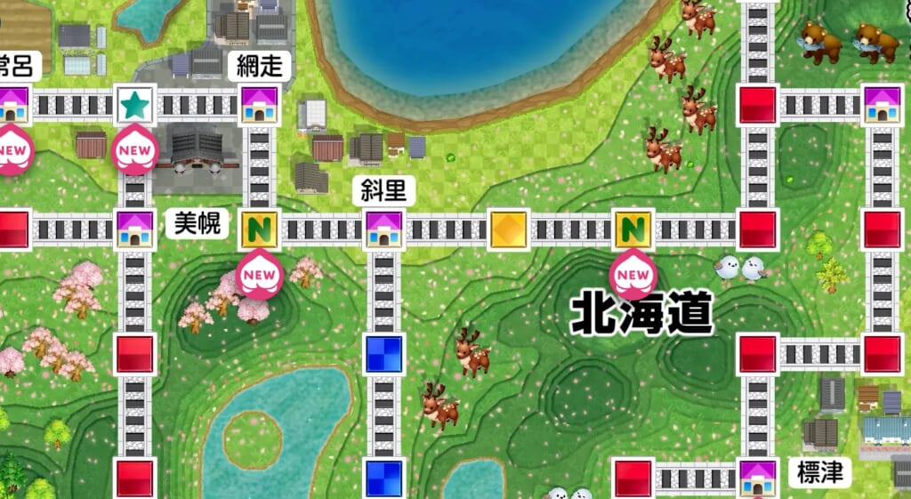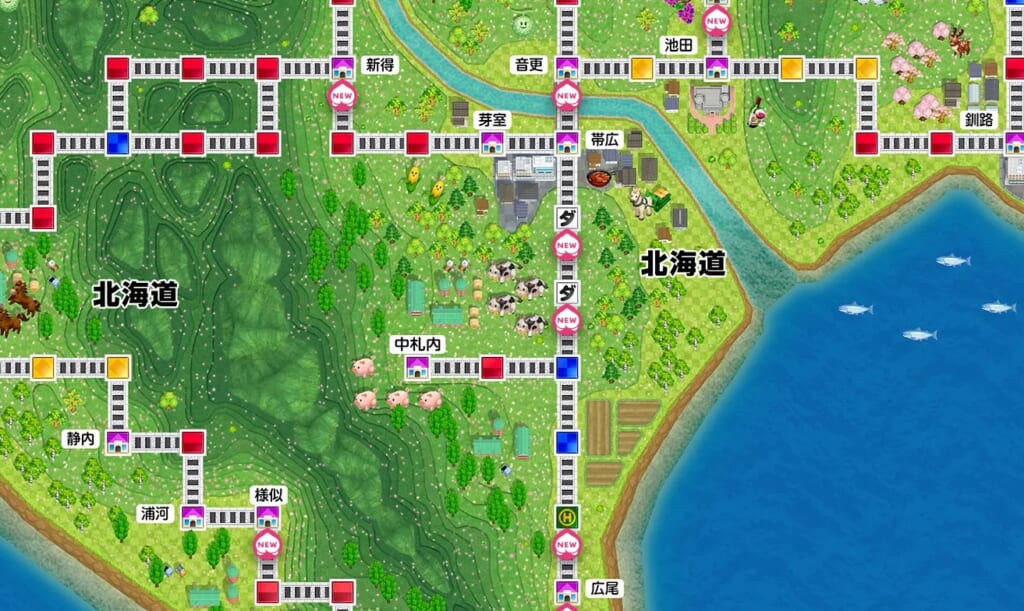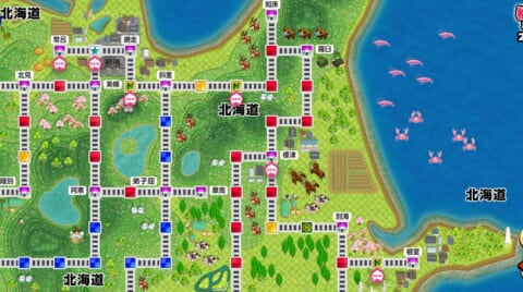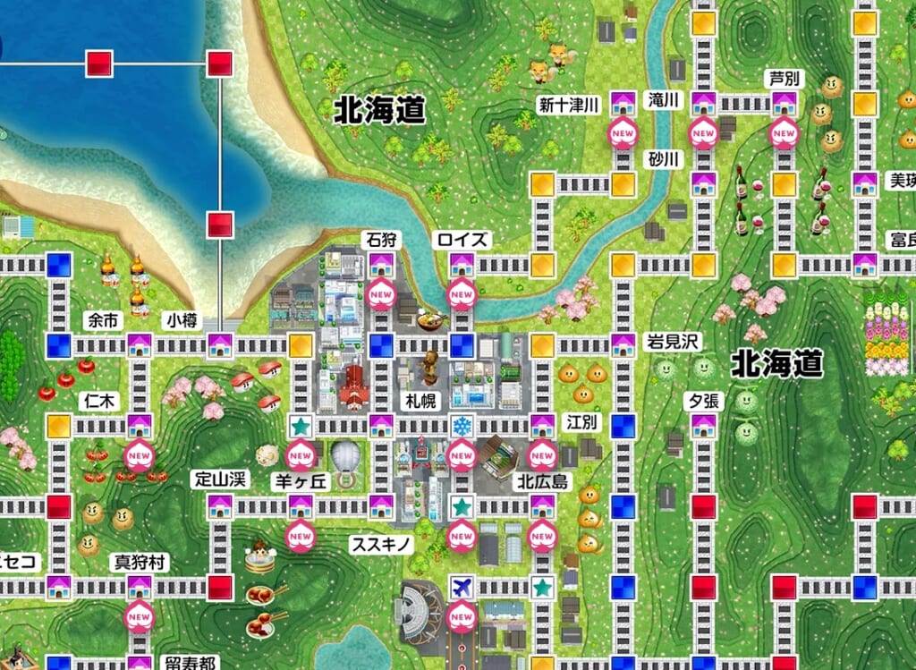 持ち金が少ない状態で赤マスに止まると物件を手放すことになる上、低確率でここから更にマイナス額が増加してしまうこともあるので、周囲1~2マスに赤マスしかない場合は移動に関するカードを使うのが安全です。