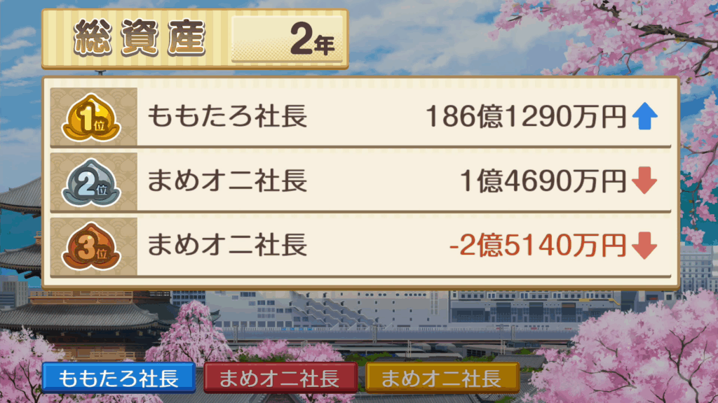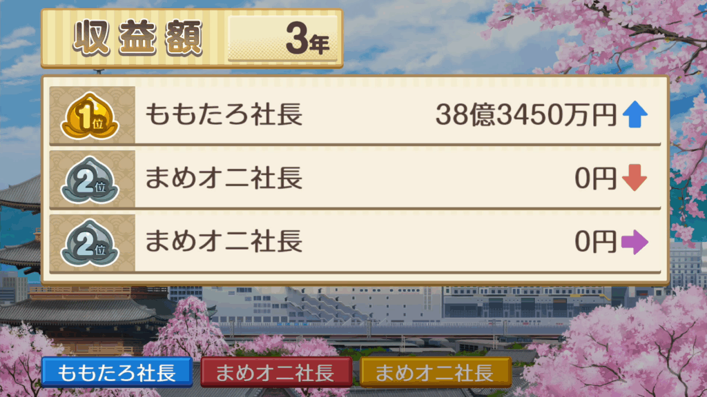 3年決戦では収益が得られるのが合計で3回のみ、そのうち1回はゲーム終了と同時に得られるため、決算後に物件の購入ができるのは合計で2回と、物件の購入が他のモードに比べて非常に行いづらいです。