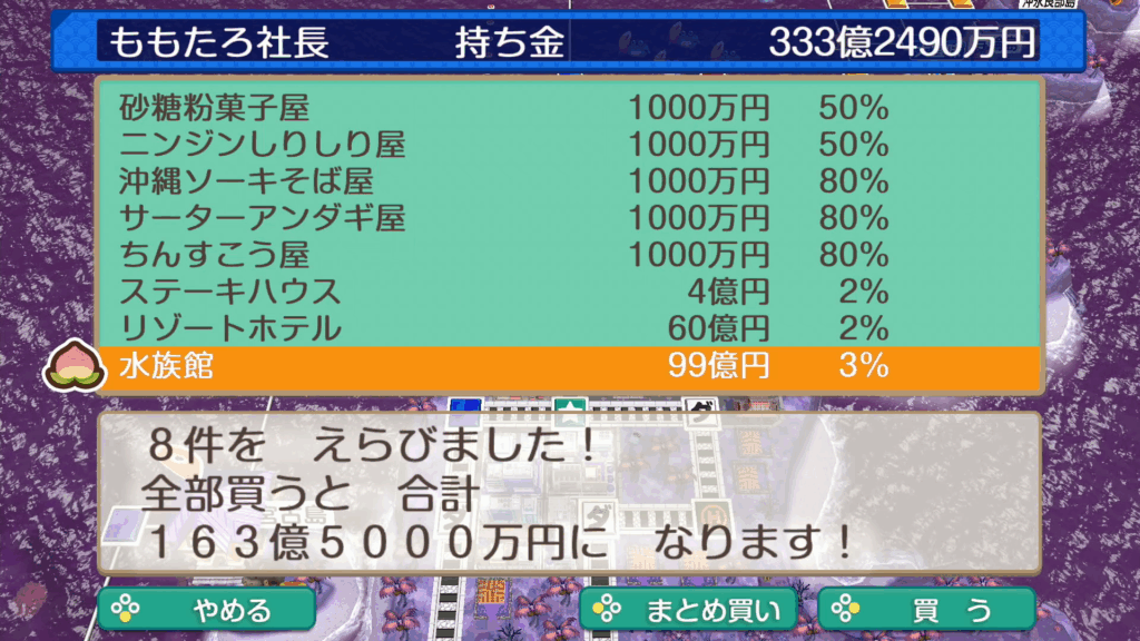 物件の収入額はなるべく100%を超えるものを探し、現在の持ち金で独占可能な物件駅を狙うのが最も収益につながります。