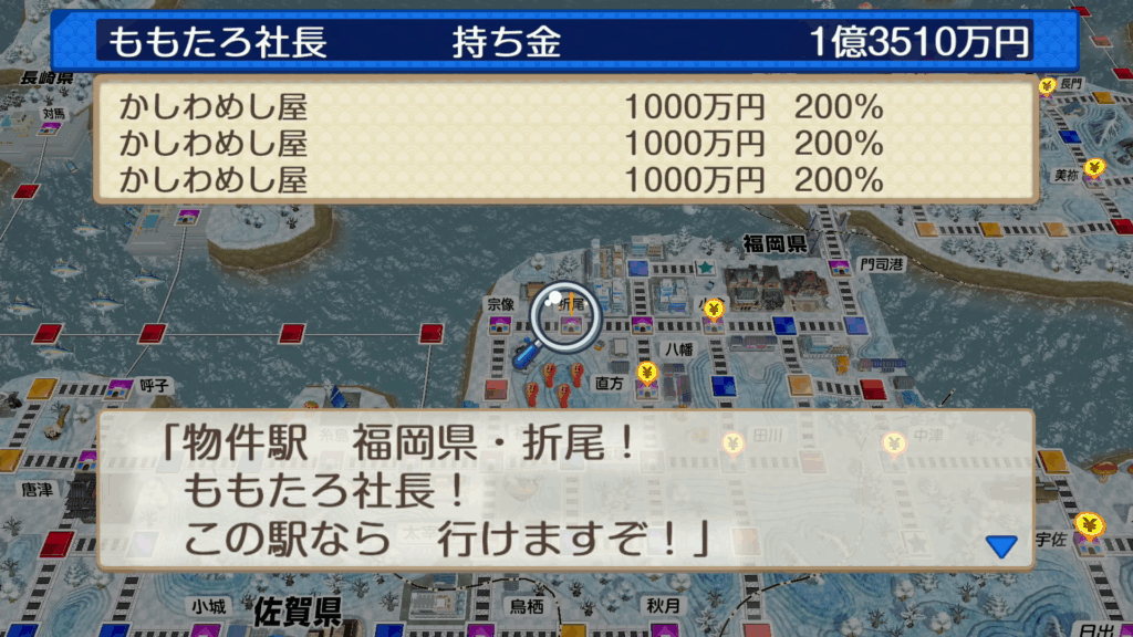 スリの銀次は物件駅やヘリポート駅には出現しませんので、現金が多い場合はスリの銀次が出現しない駅に止まる意識を持ちましょう。