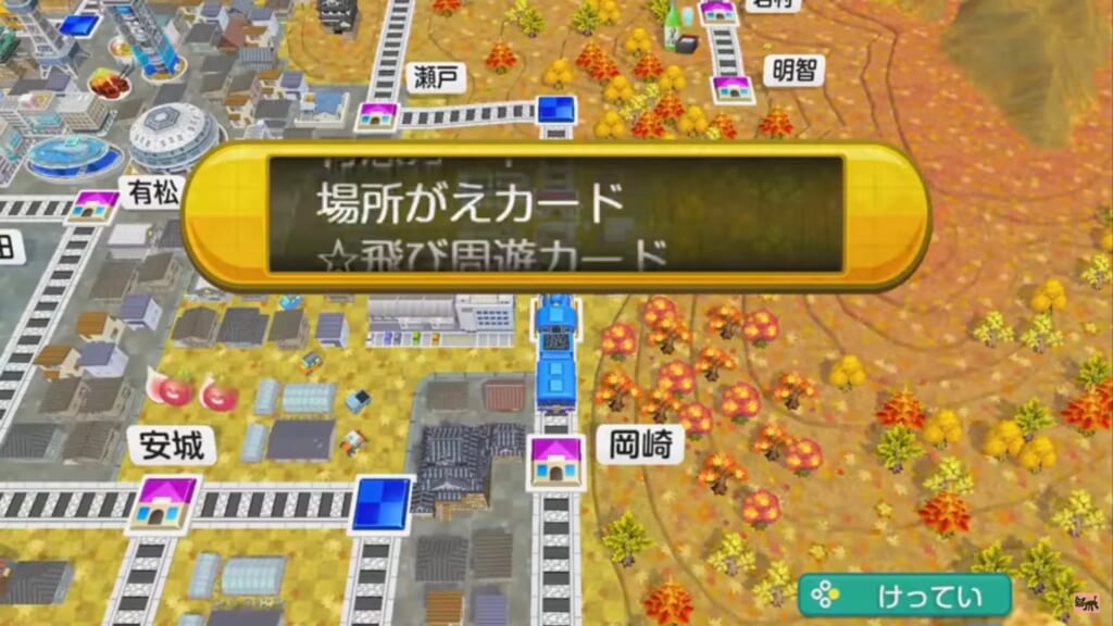 ぶっとび系のカードの中でも、☆飛びカード、ヘリポートカード、最寄りの駅でカードなど、特定の駅に移動できるカードの場合は、行き先候補を見た後に「やめる」を選択することができるので、結果次第でどのような立ち回りをするか柔軟な選択が可能になります。