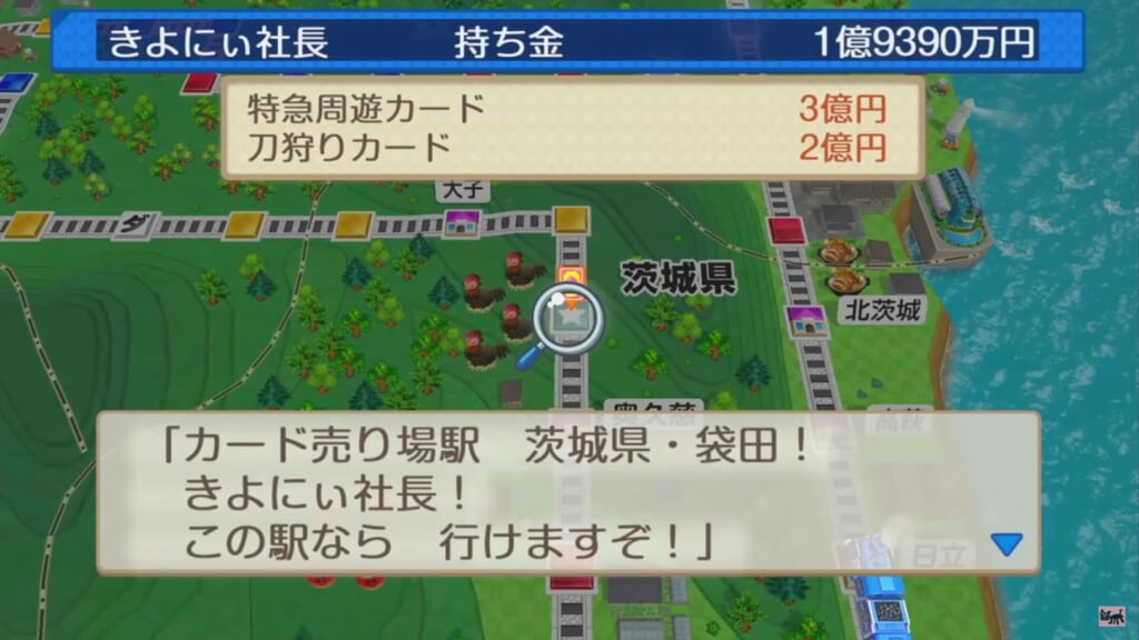 カードはカード駅(黄色い駅)に止まることで、ランダムに1枚無料で手に入ります。