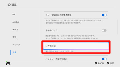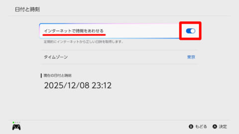 更新日時を過ぎているのにアップデートが出来ない場合は、Switch本体の日付と時刻の設定を確認して、「インターネットで時間をあわせる」がONになっているかどうか確認してください。