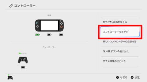 ホーム画面に戻り下のアイコンの並びにある「コントローラー」を選択後、「コントローラーをさがす」で使用したいコントローラーを登録しましょう。