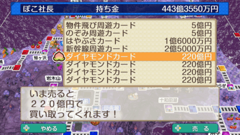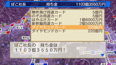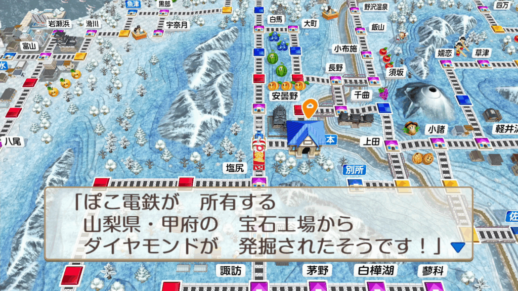 甲府 駅の「宝石工場」を所有した状態で数カ月が経過すると、ターン開始時に、「ダイヤモンドが発掘された」との通知が届き、ダイヤモンドカードが手に入ります。