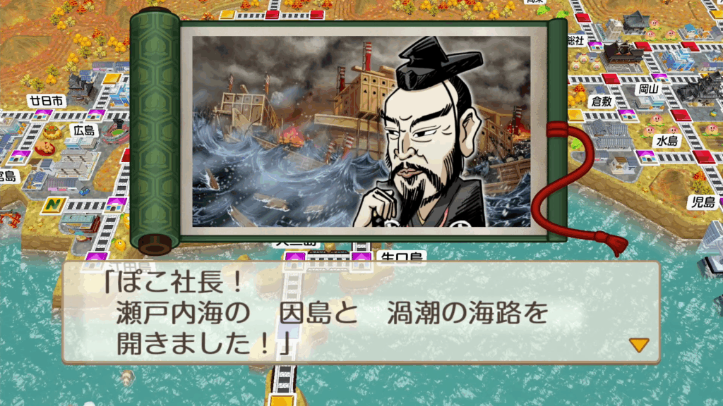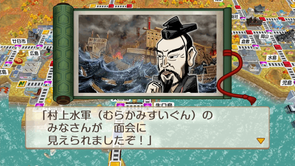 村上水軍は、広島県にある 因島 の物件を独占した次のターンに加勢してもらうかどうかを選択できます。