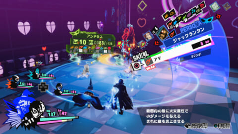 ペルソナ召喚中は戦闘の時間が止まり落ち着いて相手の弱点を確認することができるようになるため、相手の弱点にあったスキルを選択して戦闘を有利に運びましょう。