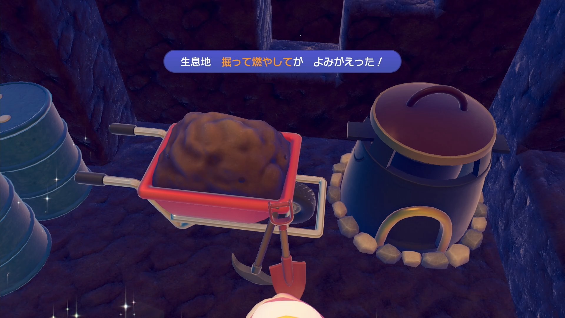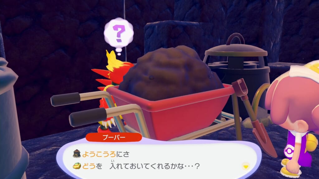 奥に進み、溶鉱炉の横に規定のアイテムを設置し、生息地「掘って燃やして」を作って ブーバーが出現するのを待ちます。