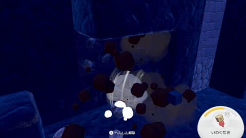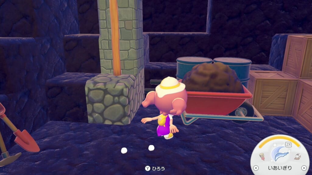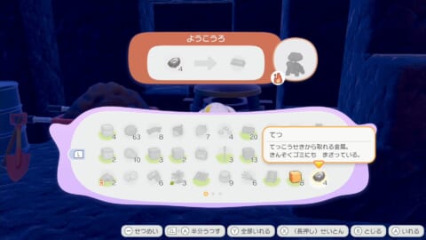 強化された「いわくだき」で洞窟にある灰色の鉱石を壊し、てつを手に入れます。