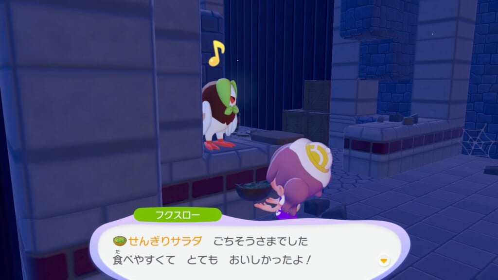 上記の画面のように、食材の横にフクスローの姿が表示されている状況でサラダを作りましょう。