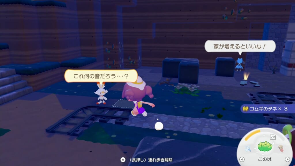 ヒバニーとの会話イベントで示された地点を掘り進み、置かれているロトムを調べて会話イベントを発生させます。