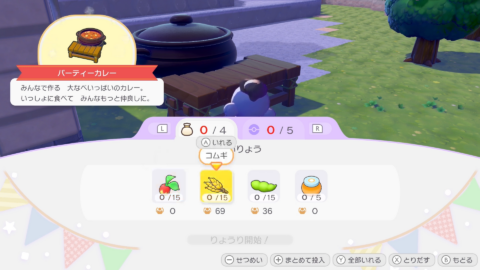 パーティーを開くにはパーティーカレーを作る必要があり、ヒメリのみ・コムギ・マメが15個と・あまいミツが5個必要です。