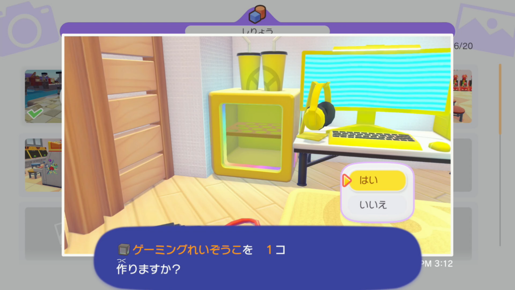 カメラ機能(-ボタン)を起動後、オブジェクトモード(Yボタン)を使用してアイテムを撮影した写真を ポケモンセンターにあるプリンターに見せることで家具の複製を行えます。