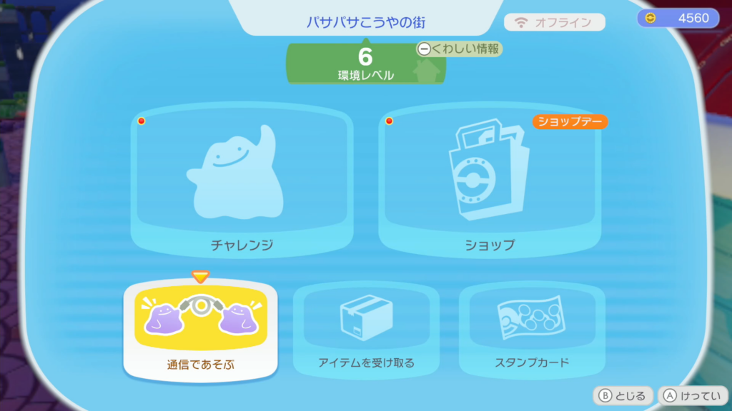 ポケモンセンターの横にあるパソコンを調べ「通信であそぶ」を選択します。