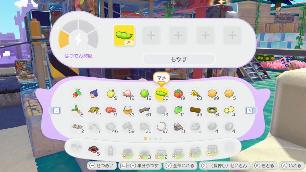 はっぱやマメなど、燃やすことができるアイテムは火力発電装置に入れることで発電が可能です。