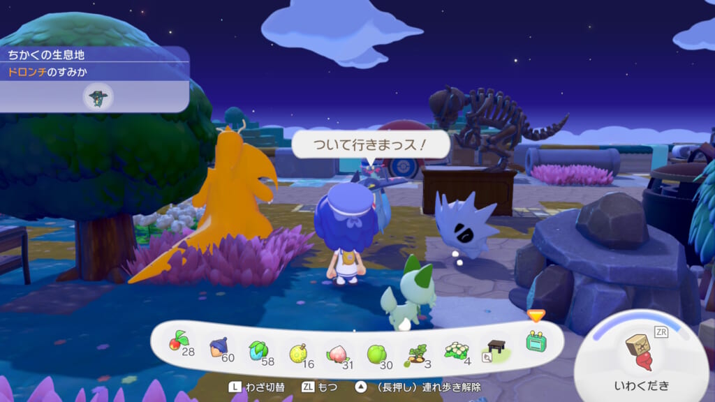 1. 連れ歩きたいポケモンと会話し「いっしょに行こう」を選択する、または対象のポケモンの近くで十字キー↑を押す