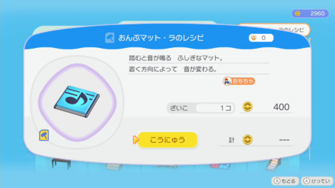 キラキラうきしまの街の環境レベルを6以上にすると、ショップにレシピが並びます。