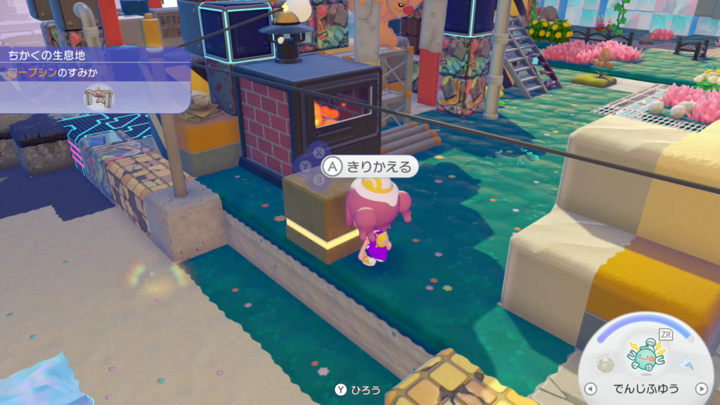 スイッチはAボタンでインタラクト、ゆかつきスイッチは踏むことで周囲の隣接した装置やインタラクト可能な家具が作動します。