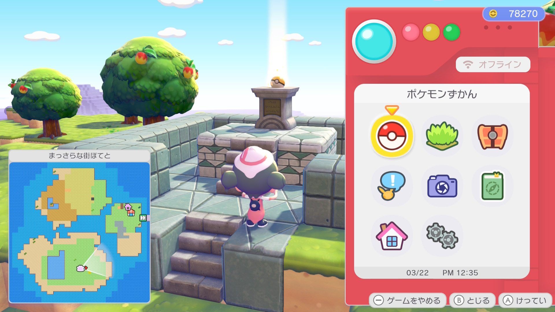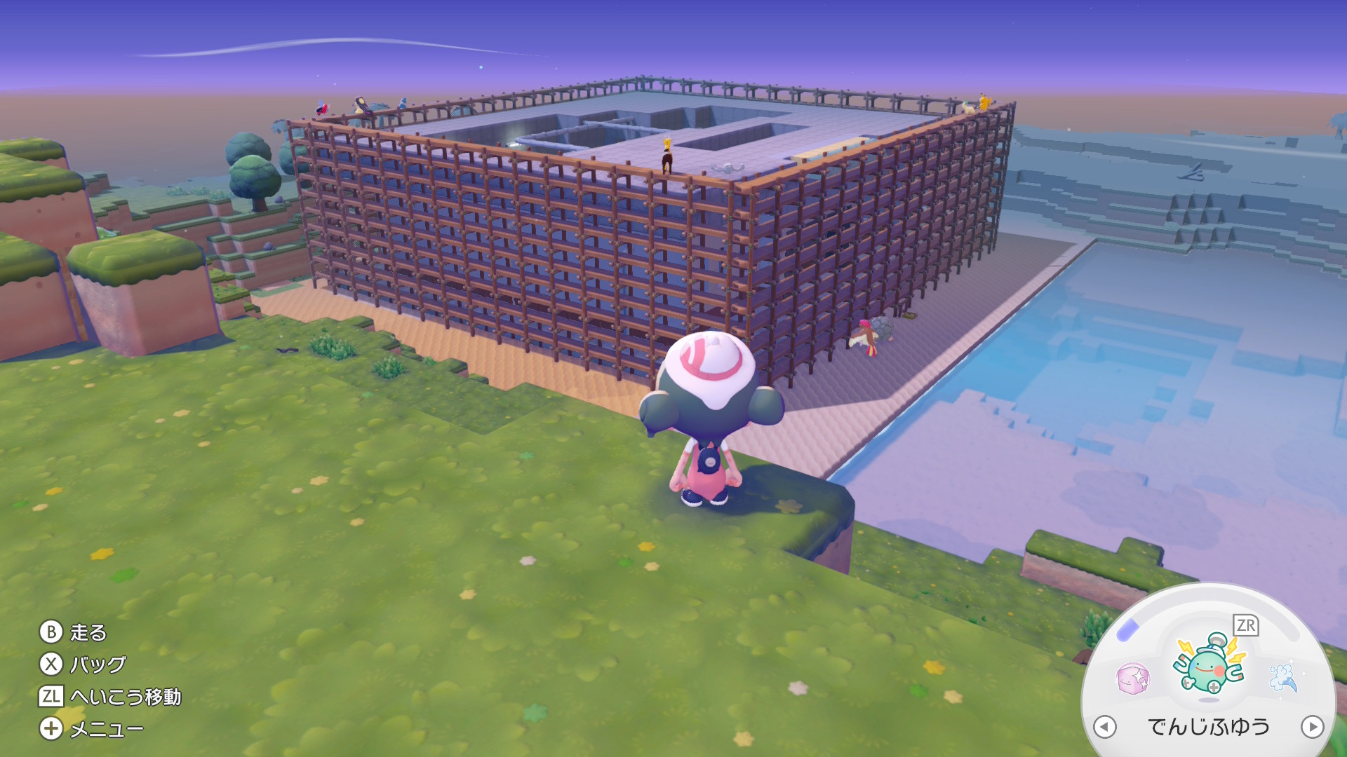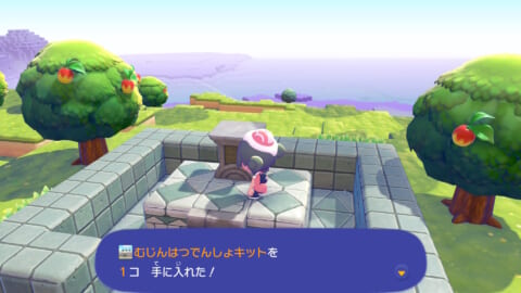 建築キットは、まっさらな街の南に位置する島の山頂にあります。祭壇に置かれている黄色のモンスターボールが「むじんはつでんしょキット」です。