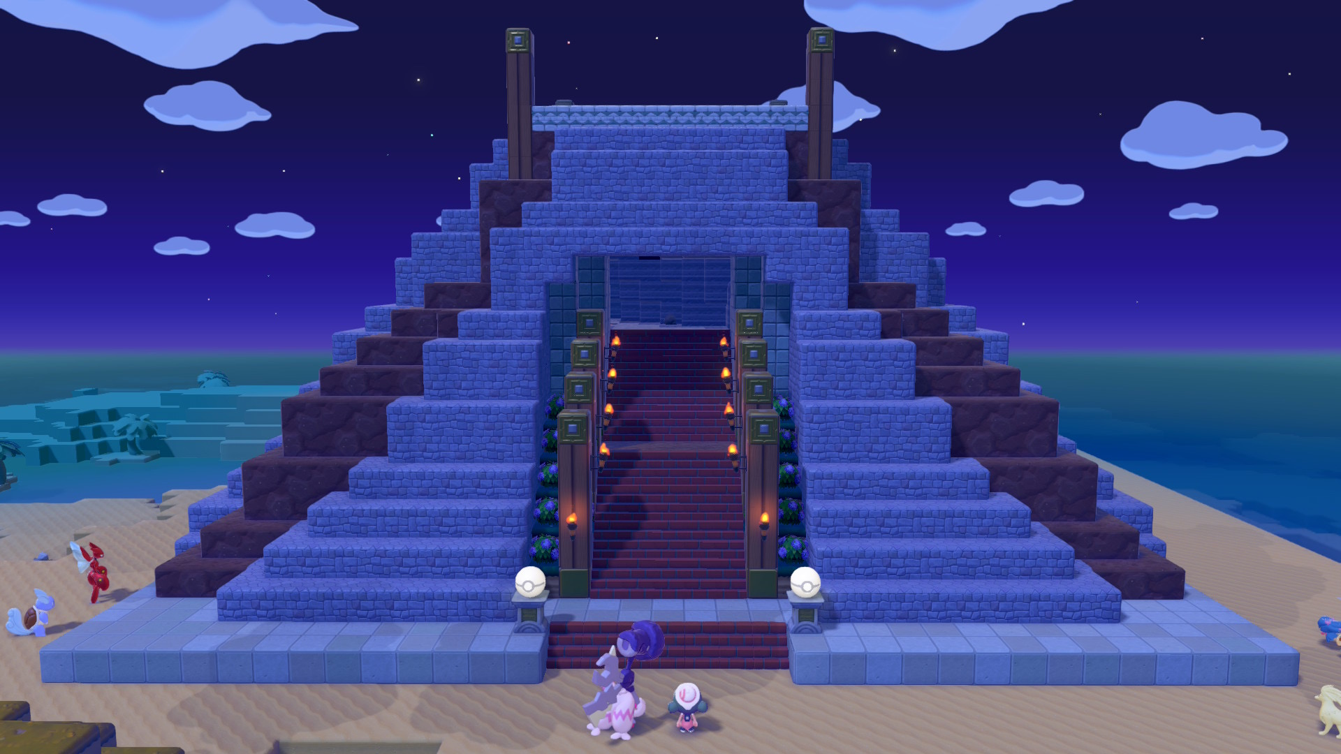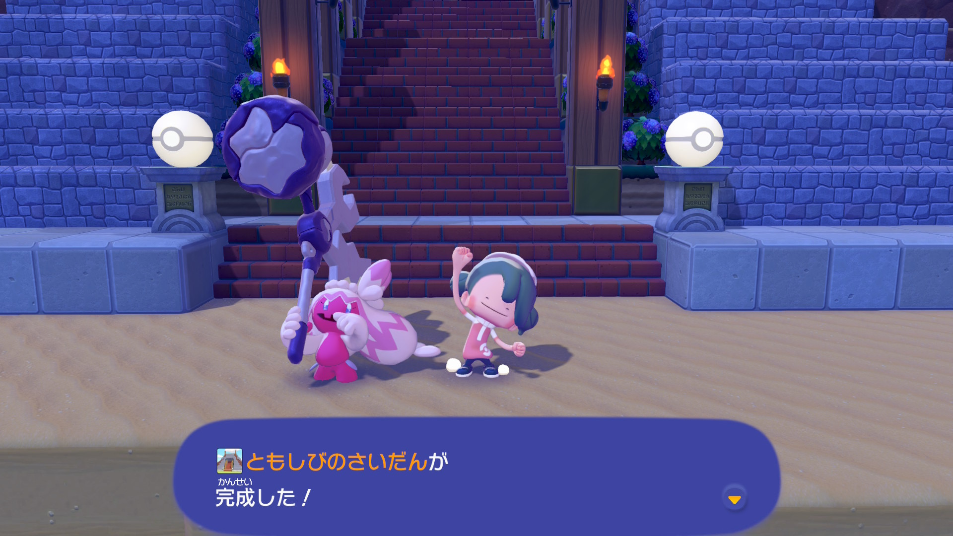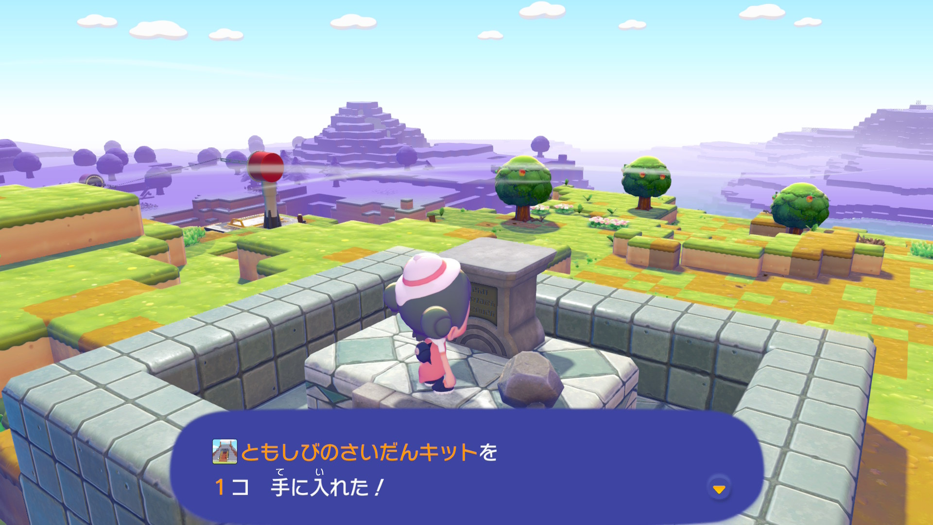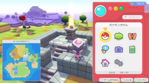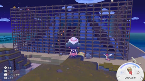 建築キットは、まっさらな街の北に位置する島の山頂にあります。祭壇に置かれている黄色のモンスターボールが「ともしびのさいだんキット」です。