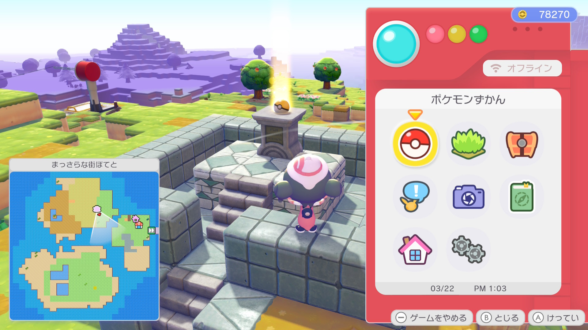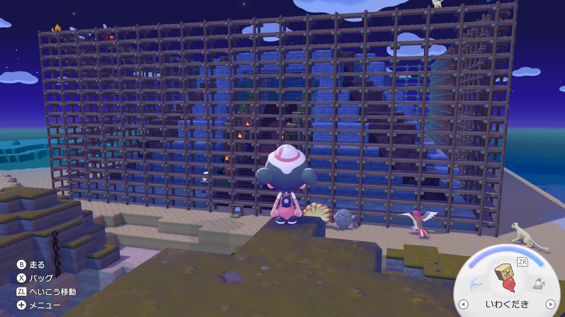 まっさらな街へは、エリア「パサパサこうやの街」の西側から入れます。ゲーム序盤から行ける場所ですが、ファイヤーを入手するには規模の大きい建築に挑まなくてはいけないため、先にストーリーを進めてメタモンの能力(わざ)を高めておくことをおすすめします。