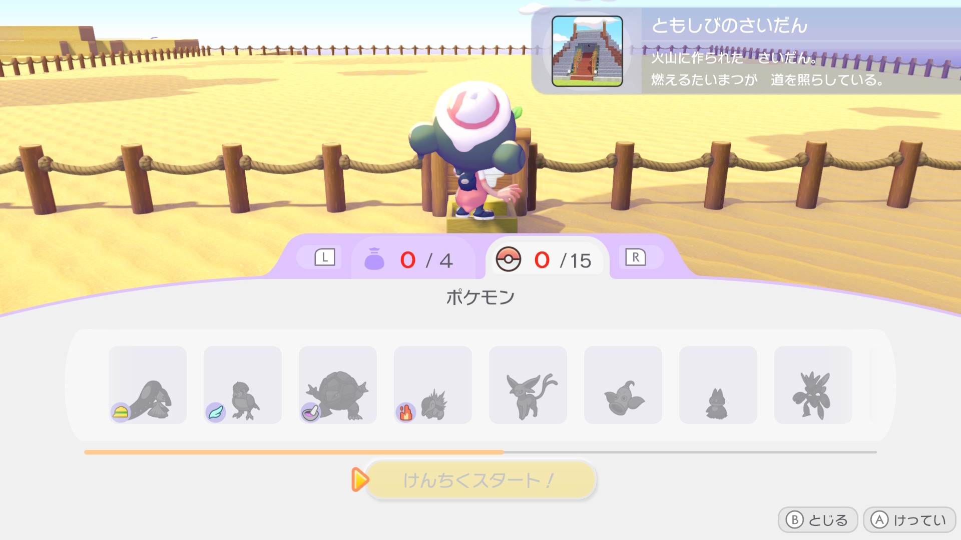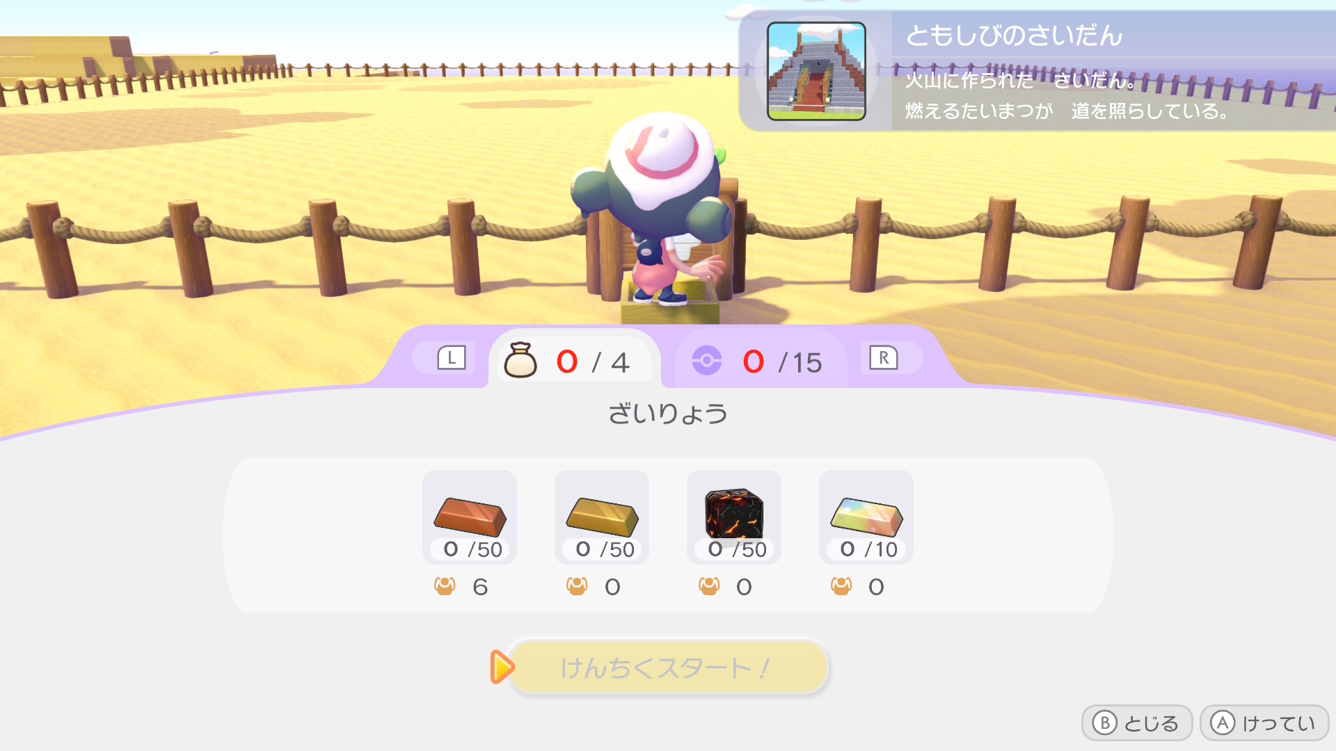 建築を手伝ってもらうポケモンと、建築に必要な材料を集めましょう。