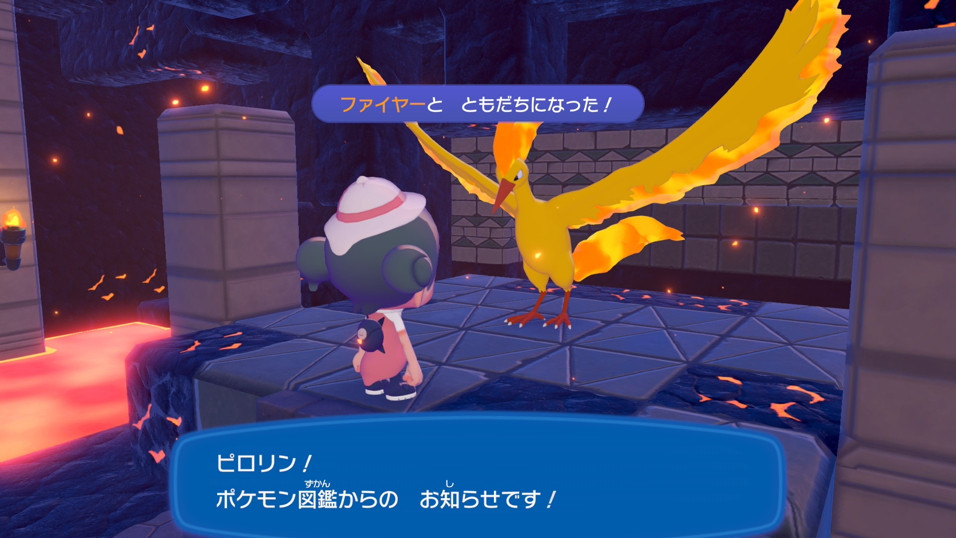 ぽこあポケモンのファイヤーは、「ともしびのさいだん」の中に出現するので、建物の奥にいるファイヤーに話しかけて仲間にしましょう。