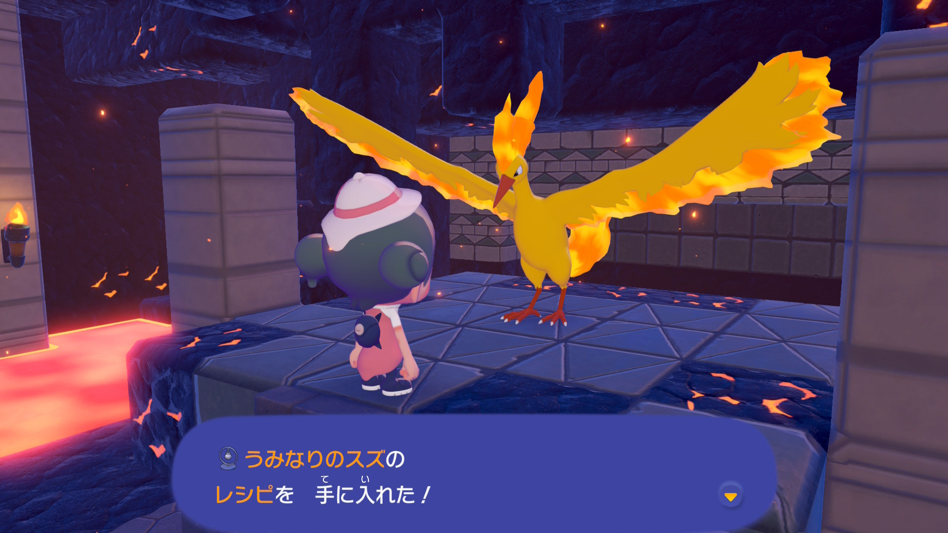 伝説の三鳥(フリーザー/ファイヤー/サンダー)が全て図鑑に登録されるとアイテム「うみなりのスズのレシピ」がもらえます。