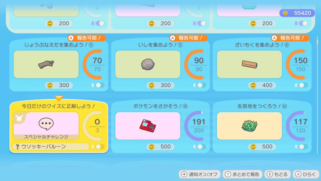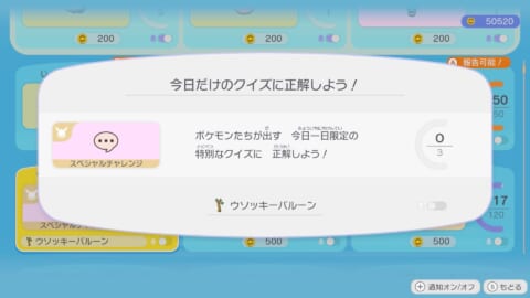 「スペシャルチャレンジ」が発生する。 友だちになったポケモンが出す特別なクイズに合計3問正解すると報酬がもらえる |