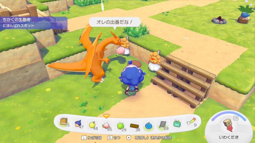 生息地「にほんばれスポット」を作成したら、得意なことが「もやす」のポケモンを「にほんばれスポット」の元へ連れてきましょう。