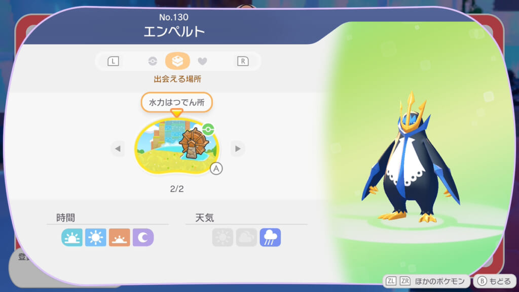 たとえば、画像のようにエンペルトは、天気が雨のときにのみ出現するポケモンです。