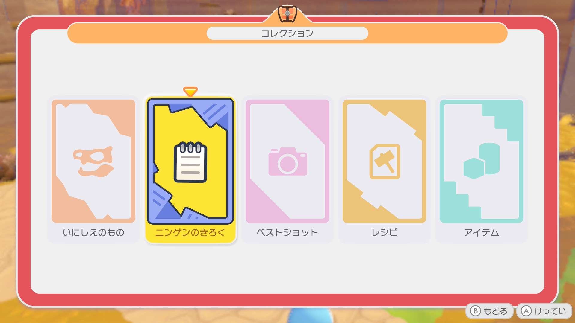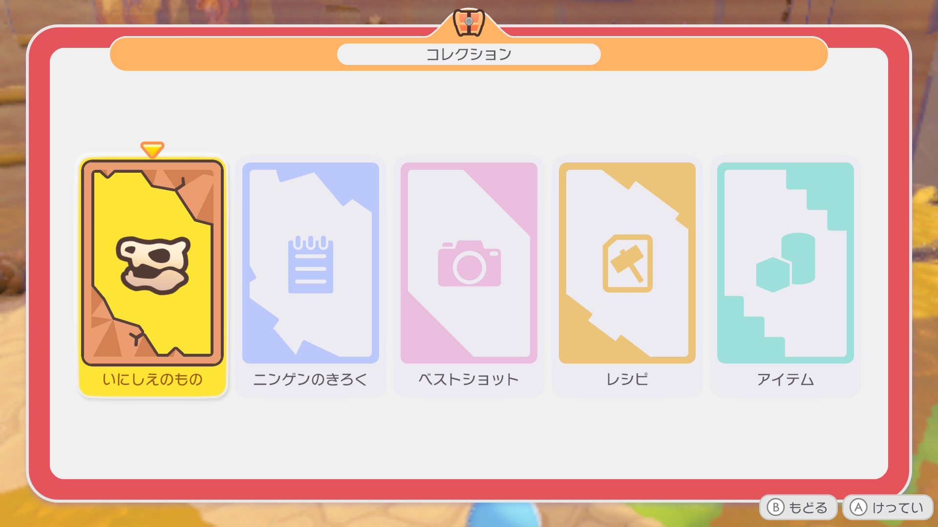 「+」ボタン(メニュー)を押し、宝箱のアイコンを選択すると、これまでに集めたコレクションを確認できます。