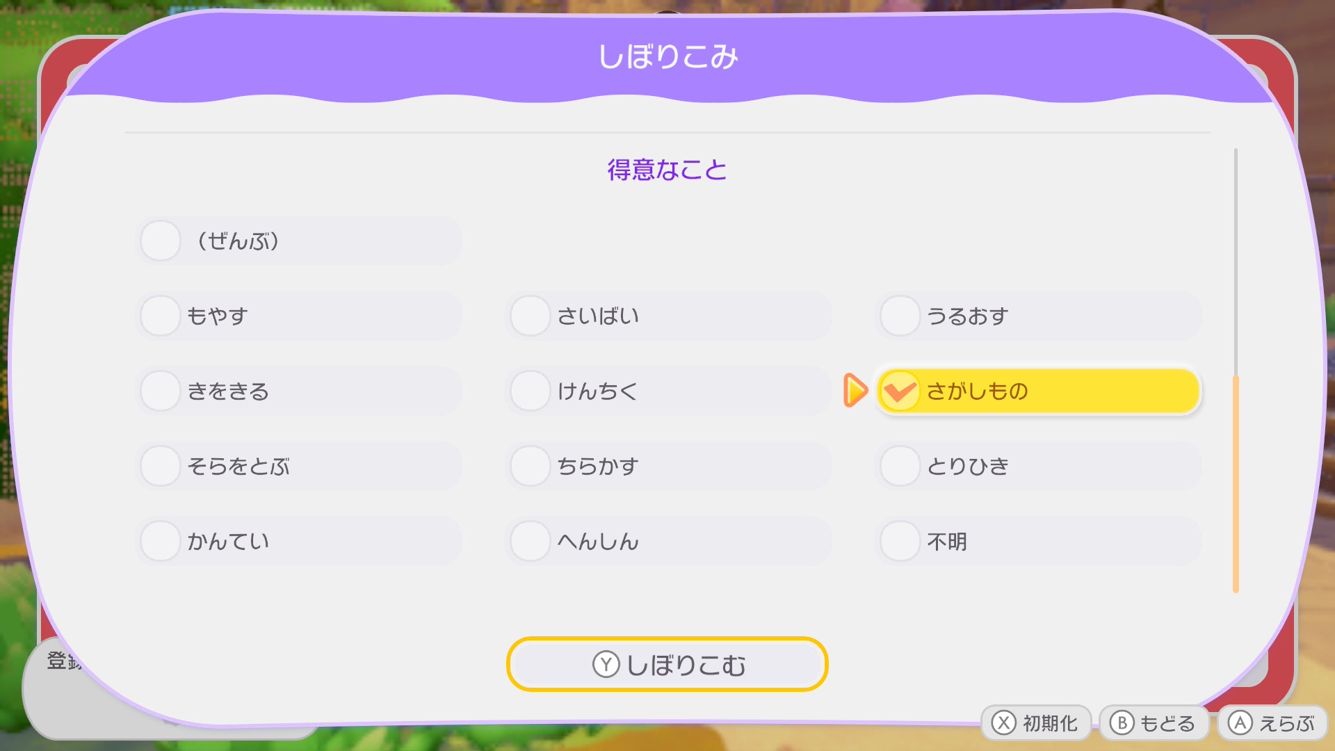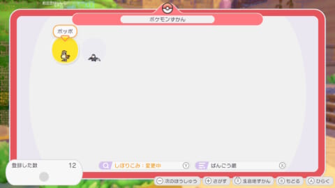 ▼どのポケモンが「さがしもの」が得意なのか知りたいときは絞り込み機能が便利です。(「+」メニュー>ポケモン図鑑>「Y」しぼりこみ)