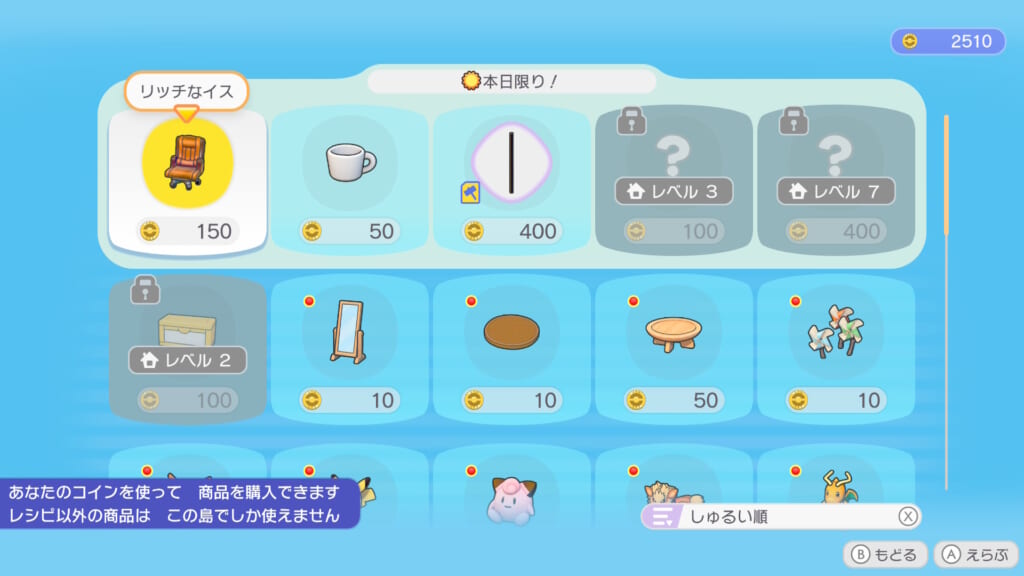 ショップについても「日替わりミッション」同様に、クラウド島限定の本日限定アイテムを入手することができます。