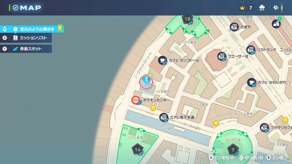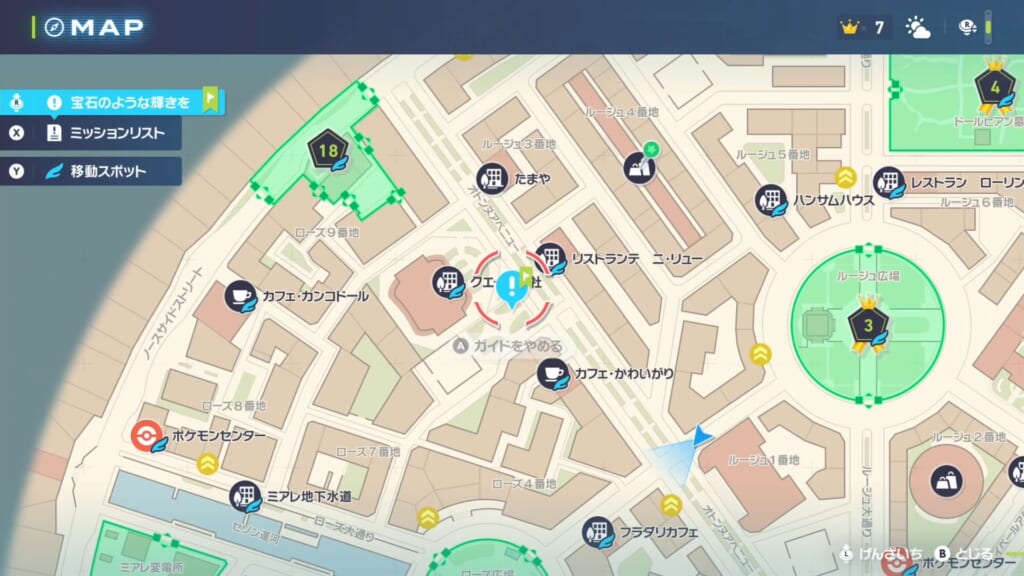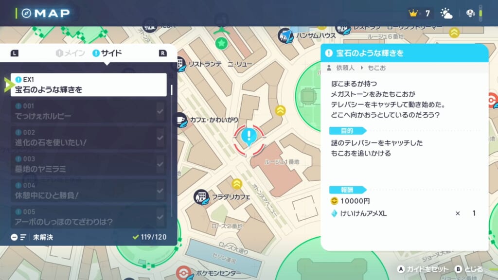 マップからサイドミッションを選択し「宝石のような輝きを」を選択することで、もこお(ニャスパー)がいる目的地が表示されるようになります。