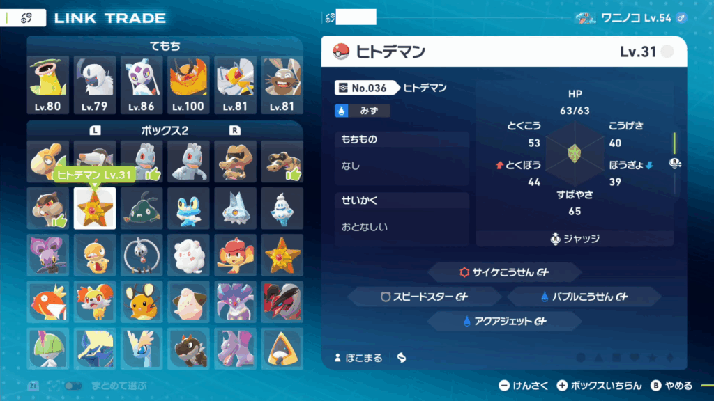 ボックスの中にいるポケモンから、交換に出したいポケモンを選択しましょう。