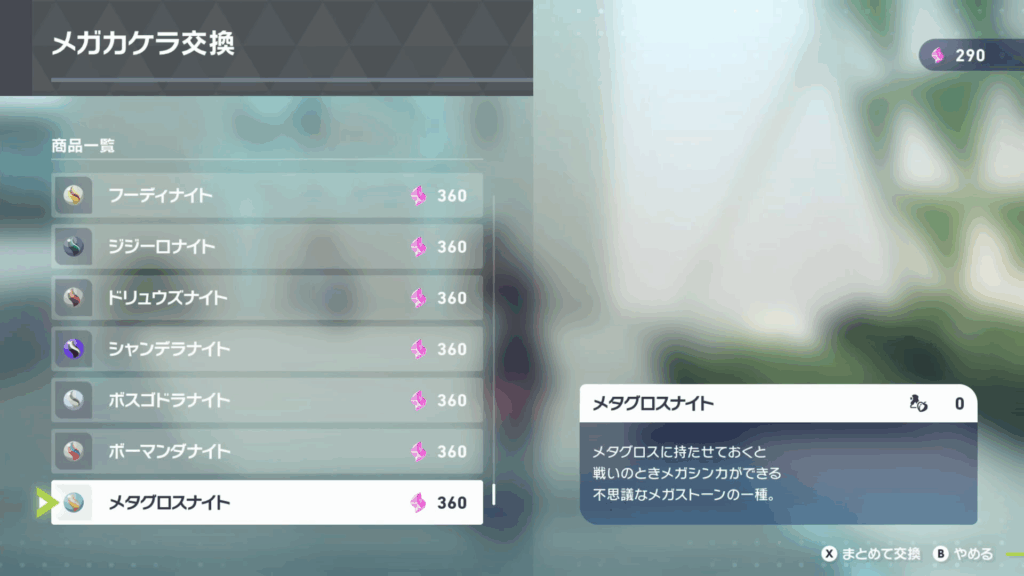 メタグロスのメガシンカに必要な メタグロスナイト は、クエーサー社でメガカケラ360個と交換できます。