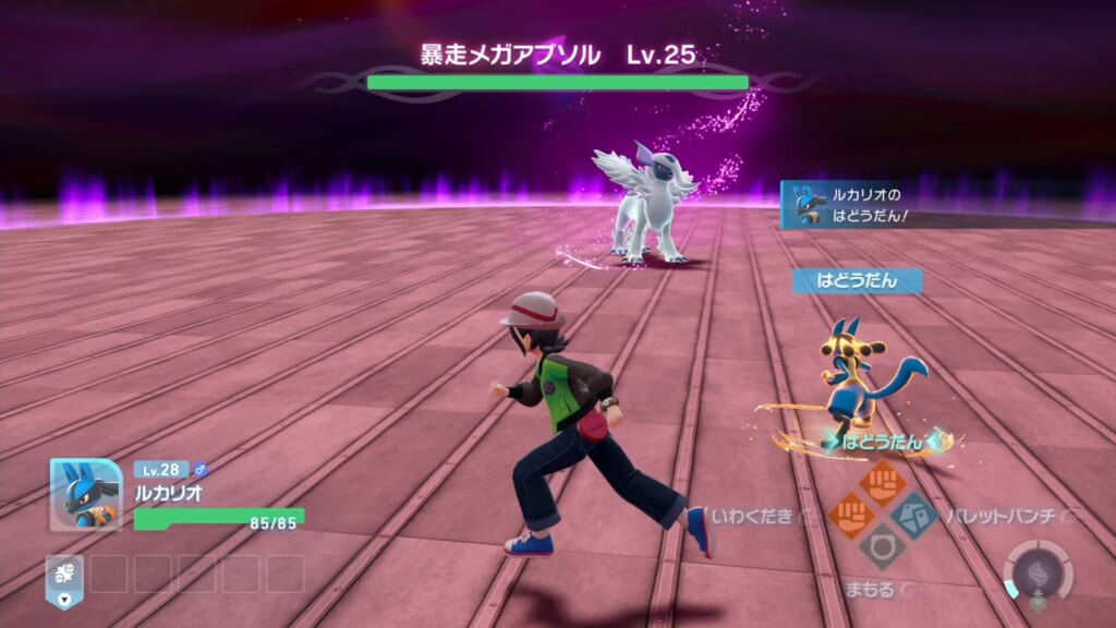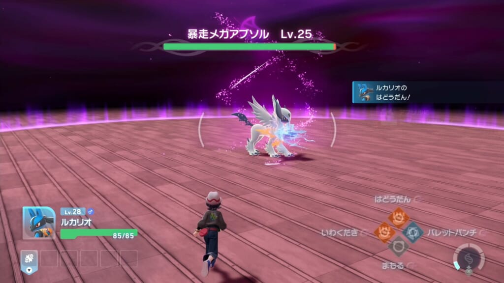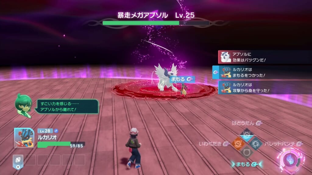 技を避けられない状況では、 まもる を選択するか、十字キー下でルカリオを手持ちに戻すことでダメージを抑えられます。