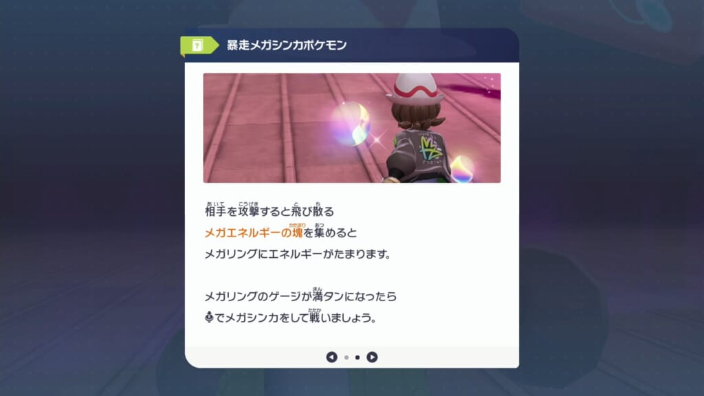 これを回収すると画面右下のエネルギーが溜まっていき、ゲージが満タンになって輝いたらRスティック押し込みでメガシンカしましょう。